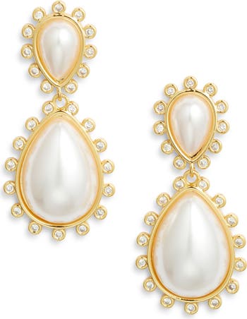 Lustrous faux pearls glow in crystal-framed settings on these double drop earrings plated in 14-karat gold.