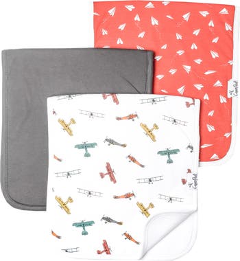 Pretty flowers and fanciful images pattern a set of generously sized cotton burp cloths perfect for carrying with you wherever you and your little one go.
