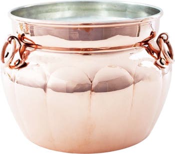 Our Vintage Inspired Copper Cauldron Pot is a testament to the timeless allure of unique cookware, born from the memory of an extraordinary cauldron pot we discovered in France. This piece left such an indelible mark on us that its uniqueness became the cornerstone of our inspiration to recreate and share its beauty. Unlike any other we had encountered before or since, its distinctive features compelled us to bring this design back to life, ensuring that its remarkable presence could be enjoyed by others. Crafted with meticulous attention to detail, this copper pot boasts three thick, solid copper ring handles for robust handling and transport, alongside hand-cut copper flanges artistically shaped into leaves, adding a touch of nature-inspired elegance. The entire body is adorned with a fluted pattern, enhancing its aesthetic appeal and making it a true work of art. Not just confined to the kitchen, our Vintage Inspired Copper Cauldron Pot transcends its culinary origins to become a versatile element of home decor. Whether serving as a stunning centerpiece that commands attention in any setting or repurposed as a garden pot to cradle plants or flowers, this cauldron pot brings a unique blend of functionality and beauty to your home. Its robust construction and timeless design ensure it can seamlessly integrate into any space, adding a touch of vintage charm and elegance. This copper cauldron pot is not just a piece of cookware; it's a conversation starter, a decorative masterpiece, and a bridge to the past, ready to be filled with new memories and stories in your home. *Dimensions: 9.5"Diameter x 6.25"Deep *Care instructions come with your purchase About Coppermill Kitchen Coppermill Kitchen marries vintage character and modern luxury to produce pieces with a timeless style and functionality. Designed with an expert eye for detail, each piece has a story to tell and will be cherished for generations to come.
