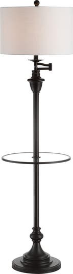 This floor lamp design offers both classic form and function. It comes with a built-in glass tray at perfect side-table height that's ideal for holding your favorite novel or a TV remote. A step-on on/off switch and swing arm make it a practical choice for reading areas. Simultaneously, the black finish, urn-shaped column detail and cotton drum shade make it an impeccable addition to any style of home decor.