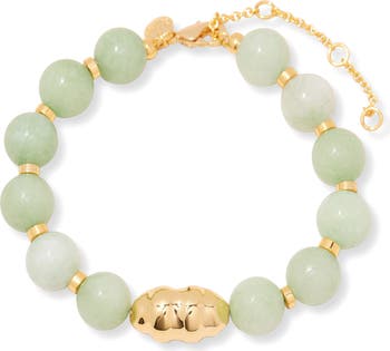 Smooth jade beads and 14-karat gold-plated accents lend bold color and refined shine to this chunky bracelet.