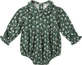 A charming Peter Pan collar sweetens the appeal of this long-sleeve bodysuit shaped from a lightweight linen blend and featuring a ditsy floral print.