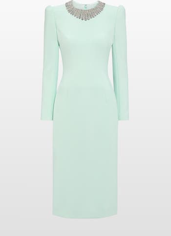 Exude sophistication in this elegant midi dress, designed to make a striking statement. The padded shoulders create a bold, structured silhouette, adding a modern touch to the classic design. The neckline is the focal point, intricately embellished to resemble a statement necklace, with shimmering details that draw the eye and elevate the look. Long sleeves add an air of refinement, balancing the dramatic neckline and giving the dress a polished finish.