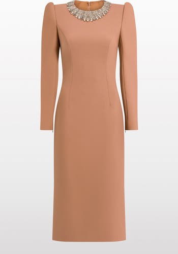 Exude sophistication in this elegant midi dress, designed to make a striking statement. The padded shoulders create a bold, structured silhouette, adding a modern touch to the classic design. The neckline is the focal point, intricately embellished to resemble a statement necklace, with shimmering details that draw the eye and elevate the look. Long sleeves add an air of refinement, balancing the dramatic neckline and giving the dress a polished finish.