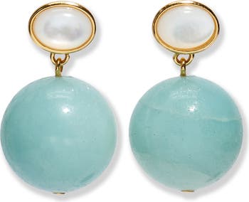 Glossy amazonite spheres suspend from mother-of-pearl studs in these refined drop earrings designed with a smooth, luminous surface.