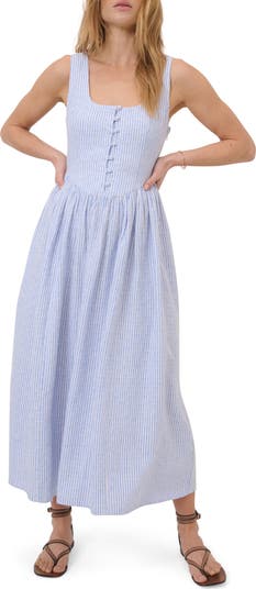 Delicate pinstripes lend timeless appeal to this summer-ready A-line midi dress made from lightweight, linen-enriched fabric.