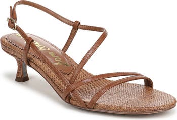 A woven footbed adds a subtle textural detail to a strappy sandal lifted by a just-right kitten heel.