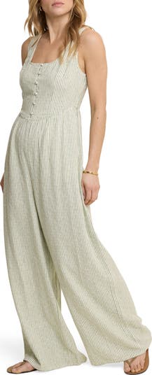 Perfect your warm-weather wardrobe with this wide-leg jumpsuit cut from a fresh, airy linen blend streaked with vertical stripes.