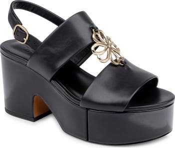 Polished floral hardware amplifies the retro attitude of this lofty platform sandal complete with a slingback strap.