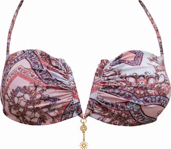 The Coral top in Tuscan Print features a sophisticated "V" wire neckline for a polished, architectural look. Designed with versatile tie-strings and a three-tier adjustable back closure, this piece ensures a secure and customizable fit, while removable padding and signature gold charms add the perfect touch of Mediterranean luxury.