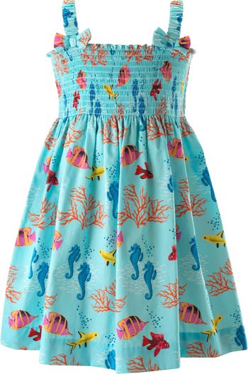 - This delightful ruched dress in vibrant sea world print on light blue cotton base is made for playtime in the sun, with bow detail and elasticated straps for extra comfort.
