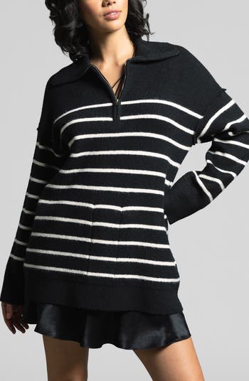 You'll feel snuggled by this roomy half-zip sweater that's wrapped in brisk maritime stripes and finished with handy pockets.