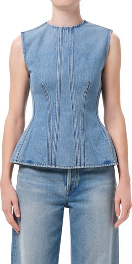 Streamlined yet statement-making, this contemporary denim top balances corsetry-inspired seaming with a softly flared peplum hem. A medium indigo wash rooted in '90s cool brings depth to the regenerative cotton blend.