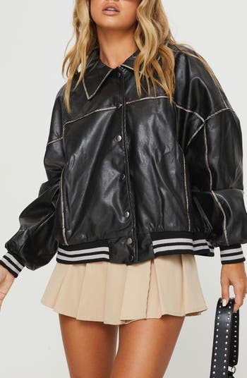 Weathered seams authenticate a faux leather jacket trimmed with varsity vibes.