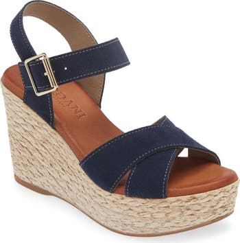 Crisscrossing vamp straps add modern dimension to an espadrille-inspired sandal lifted by a jute-wrapped platform and wedge heel.