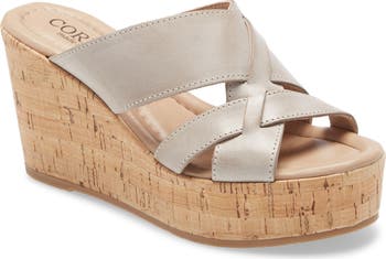 A strappy leather sandal is set on a cork wedge with rocker platform to propel your steps forward.