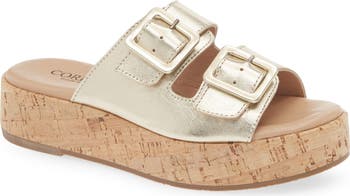 Wide, buckled leather straps stand out at the upper of an Italian-made slide sandal furnished with a cushioned footbed and lofted by a chunky flatform sole.