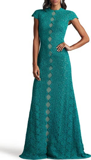 Lacy blooms create an enchanting stylescape for a fitted gown turned out in a head-turning hue.