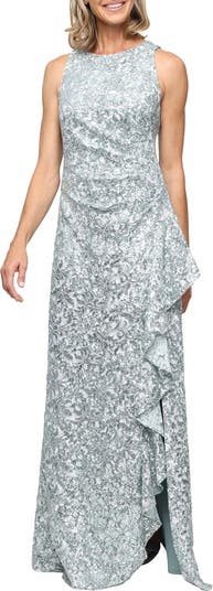 Corded lace lends rich texture to this sleeveless gown designed with a hint of stretch for a smooth, sculpted fit. Asymmetric ruching defines the waist while a ruffle trails from hip to hem, revealing a subtle glimpse of leg through the front slit.