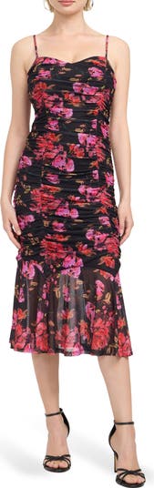 GUESS Cordelia Floral Ruched Stretch Mesh Cocktail Dress, Alternate, color, Dark Blooms