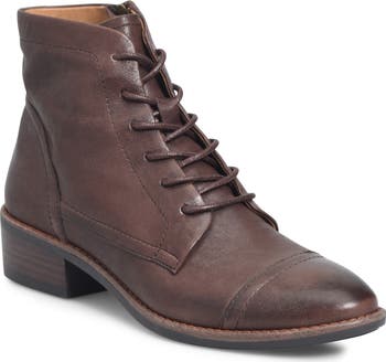 A cap toe and modest stacked heel frame a burnished leather boot grounded by a well-cushioned footbed for lasting wear.
