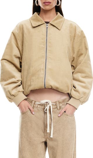 A cropped fit and puffy silhouette modernize a bomber jacket cut from soft cotton corduroy.