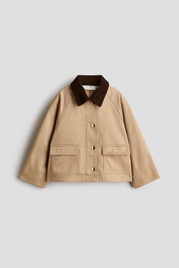 Loose-fit jacket in twill with a cotton corduroy collar and a zip and wind flap with press-studs down the front. Long raglan sleeves and flap front pockets. Lined.