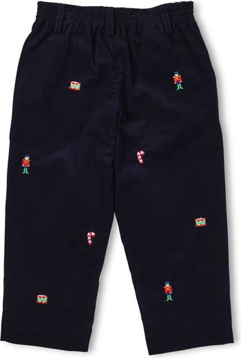 - 100% cotton navy 21 wale corduroy pants with embroidered Christmas trees, back elastic waist, belt loops, fake fly, front slant pockets.
