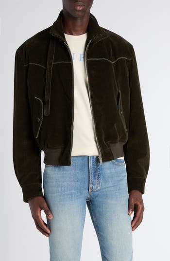 Rendered in dense Italian corduroy with a velvet-like handfeel, this jacket sculpts an abbreviated bomber stance with a rib hem and a smooth zip closure. A bold strap bites across the stand collar for attitude, while a signature T-bar at the nape delivers in-the-know hardware with subtle gleam.