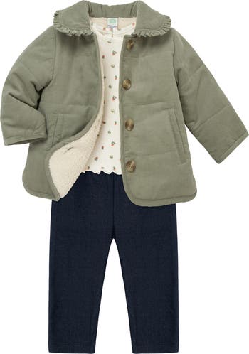 A corduroy jacket lined in ultraplush fleece keeps baby feeling comfy and cozy in this set complete with a patterned tee and leggings.