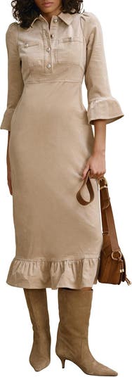 Corduroy shirt dress in a midi silhouette featuring a classic collar, chest pockets, puff shoulders, 3/4 fluted sleeves, ruffle hemline with a button fastening through the front.