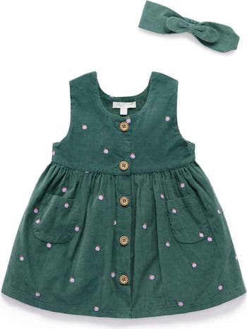 Our Embroidered Corduroy Pinnie Set is a versatile layering outfit for transeasonal weather. Featuring a pinnie with a pretty all over apple embroidery, gathered skirt and wood look buttons, and matching bow headband Made from soft, plush 100% Cotton mini corduroy. Layer with a Sweater and cardigan in cooler weather.