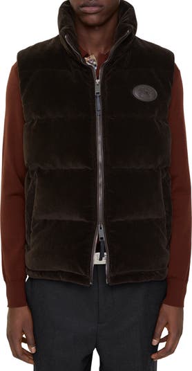 A puffer gilet made from cotton corduroy, filled with goose down and feathers. The style is lined in Burberry Check cotton in a truffle brown colourway and features an appliquéd leather Knight stamp – an archival motif first seen on Burberry bags in the 1980s. Cut to a relaxed fit with a packaway nylon hood for unpredictable weather.||Two-way zip closure|Packaway drawcord hood|Side zip pockets|Drawcord hem|Leather patch with Equestrian Knight Design at chest|Burberry Check lining|Comes with a garment bag