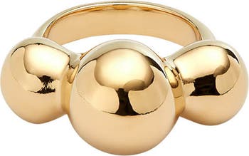 Three polished spheres rise from a slender 18k gold-plated or sterling silver-plated shank, forming a clean, architectural silhouette that plays with balance and light.