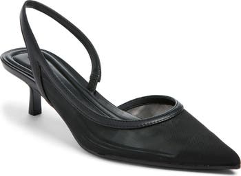 A sharp pointy toe and half d'Orsay profile bring crisp angles to this breezy mesh pump set on the modern-revival kitten heel.