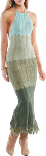 Feel all eyes turn to you from sunrise to sunset in this halter sundress featuring an ombré pattern on an intricate pointelle knit.