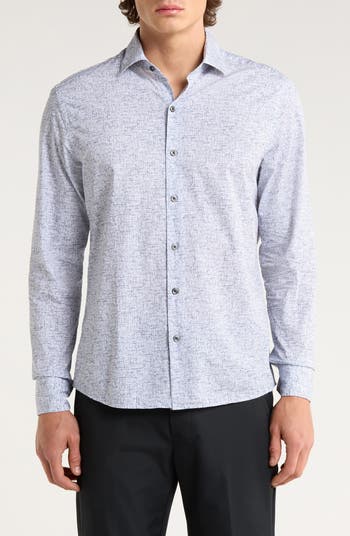 A subtle geometric print brings dimension to this button-up sport shirt made from crisp cotton.