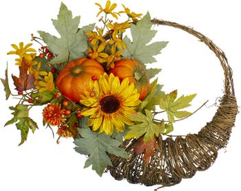 This harvest cornucopia wreath provides all the wonderful colors of Autumn. Mixed foliage in bright shades is the backdrop for pumpkins, berries, and a stunning sunflower. Perfect for hanging or used as part of your Thanksgiving table centerpiece. Product Features: Unlit Cornucopia wreath accented with berries, foliage, pumpkins and a sunflower Recommended for indoor use - if using outdoors place under a covered area Sturdy twig backing for easy hanging - hardware not included No assembly required - wreath comes in 1 piece Dimensions: 20" diameter (measured from outermost tip/edge to outermost tip/edge across the wreath) Material(s): pine cones/polyester/wire/foam/twigs