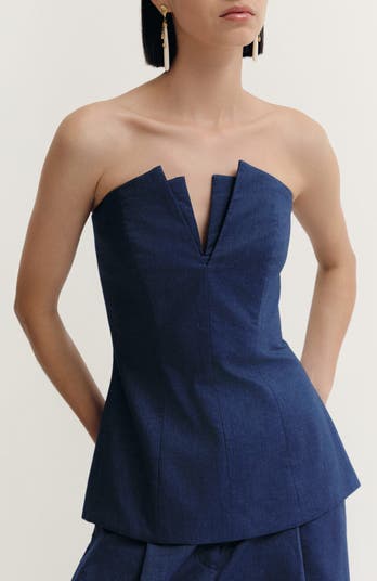 A sharp notched neckline adds architectural intrigue to this strapless top. Its contoured seams and flared hem create a sculptural silhouette that’s equally polished with trousers or our matching Panca pants.