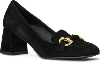 Polished bit hardware frames the keeper strap of this loafer-inspired pump designed in a square-toe profile lifted on a flared block heel.