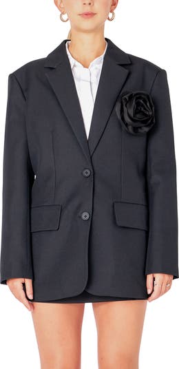 This polished two-button blazer is updated with a flowery corsage for day-to-night appeal.