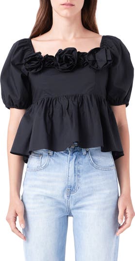 A bunch of blooms romances the square neckline of a cotton poplin top popped with pretty puff sleeves.