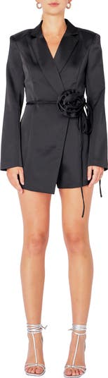 A narrow waist tie and corsage detail enhance the contemporary allure of a blazer-inspired romper shaped from smooth satin.