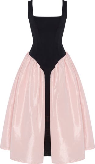 Black & pink corset dress with a square-neck bodice, cinched waist, and glossy puffy skirt—a bold blend of sculptural edge and soft drama.