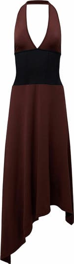 - Corseted to create a nipped-in bodice, this halter dress comes in smooth double-knit fabric with a contrast waist, a deep v-neck, an open back and an asymmetrical mid-length hem. Contrast corset waist panel Invisible back zipper Asymmetric hemline Halter neckline Open back Midi length 95% Poly 5% Spandex Machine wash with like colors. Do not bleach. Hang to dry. Iron warm.