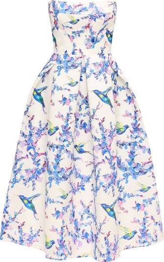 A floral midi dress in pink peony or bird & flower print where structure meets expressive color. The sculpted corset bodice shapes the silhouette, while the softly flared skirt and midi-length keep the look light and feminine. Designed for refined celebrations and stylish moments where expressive florals feel modern, composed, and intentional.