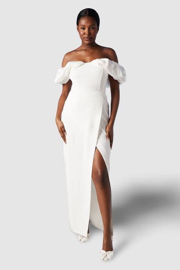 Make a stunning entrance on your special day with this exquisite wedding dress from Coast. The off-shoulder design with voluminous sleeves creates a romantic and ethereal look, while the fitted corset bodice accentuates your figure beautifully. The column skirt with a daring side slit adds a touch of allure and allows for ease of movement.