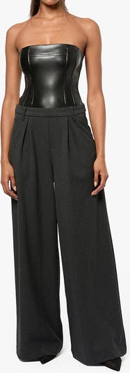- Joining a vegan leather corset to a wide-leg trouser made from suiting fabric, this jumpsuit recreates the look of separates. The style features a strapless bodice with princess seams and a zip along the back, as well as a mid-rise pant, tailored with a pleated front, slash pockets and double welt back pockets. Vegan leather corset Bodice with bonding Princes seams Mid rise pants Slash pockets Pleats at front legs Wide leg pants made of suiting fabric; Jumpsuit Invisible zipper closure at center back Double welt back pockets 100% Polyurethane Machine wash with like colors. Do not bleach. Hang to dry. Iron warm.