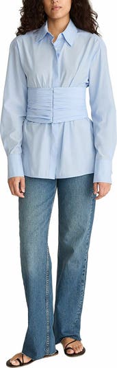 This cotton blend taffeta top has a corseted cummerbund detail at the waist with hook-and-eye closures. It has a center front placket, shirt collar and cuffs, and a shirttail hem. This piece is fitted at the waist. If you are between sizes we recommend sizing up.