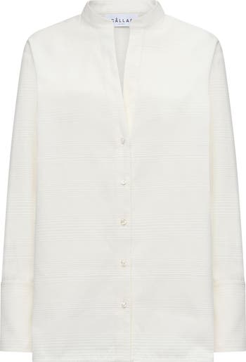Corsica is a relaxed fitting, long sleeve button front shirt with a band collar. The body is tunic length. Made from Italian cotton with tonal jacquard horizontal stripes. Made in Italy